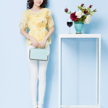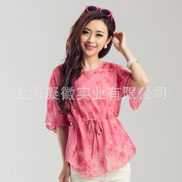 2016夏季新款時尚圓領百搭五分袖系帶印花桑蠶絲上衣襯衫女短款 /
