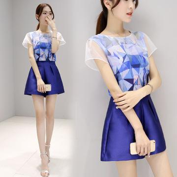 修身兩件套新款時尚小香風(fēng)短褲雪紡女 闊腿褲套裝一件代發(fā) /