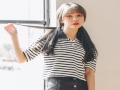 模特實(shí)拍 夏裝新款學(xué)院風(fēng)條紋翻領(lǐng)T恤上衣 /