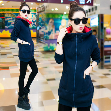372實拍中長款連帽加絨時尚純色衛衣女秋冬長袖套頭寬松外套 /