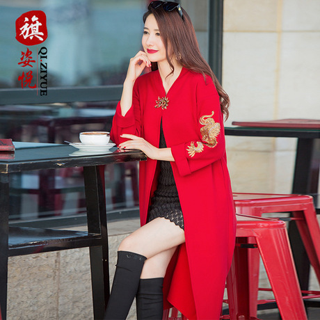 新品針織開衫旗袍大衣 韓版羊毛刺繡外套加長款大衣 /