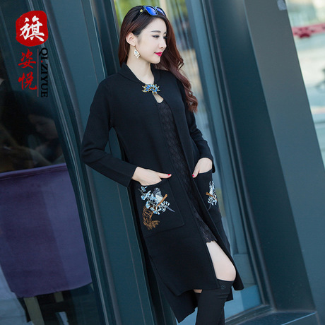 旗姿悅秋季新品針織開衫旗袍 時尚刺繡龍花中國風旗袍大衣外套 /