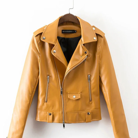 秋季新款歐美大牌黃色修身長袖機車皮衣女短款夾克 /