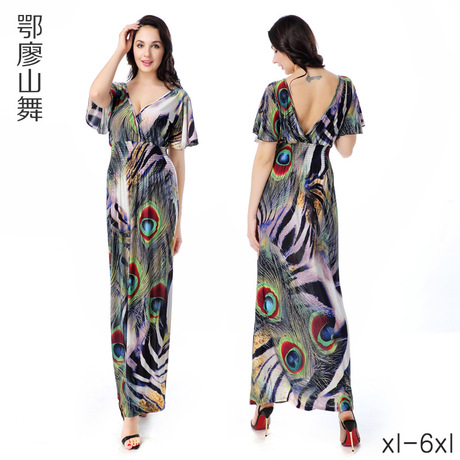 新款速賣通大碼XL-6XL歐美印花顯瘦波西米亞夏季大擺女連衣裙 /