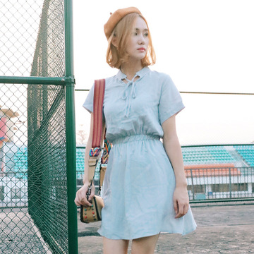 連衣裙 女式新款日系時尚小立領系帶松緊裙子 腰韓國純色短袖中裙 /