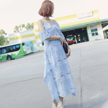 明星同款女裝超仙水溶絲刺繡花勾花鏤空不規則長裙雪紡吊帶連衣裙 /